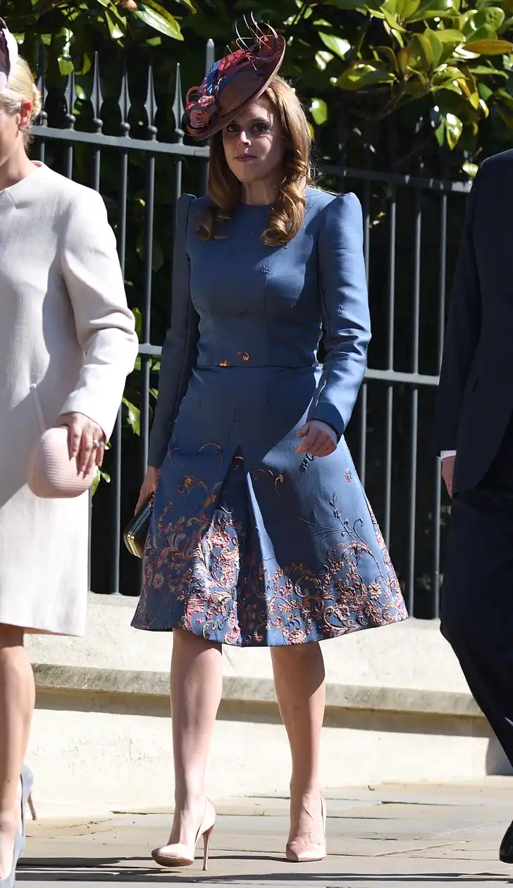 De koningin's tweede kleindochter Beatrice zag er op haar paasbest uit in een blauwe, getailleerde jurk van Claire Mischevani. De rok van haar jurk is geaccentueerd met een geborduurde bloemenprint, en de Juliette Botterill hoed die ze droeg had dezelfde kleur bloemen als detail. Om de in het oog springende look wat balans te geven droeg de prinses een zwarte clutch en sobere, huidskleurige hakken van Jimmy Choo.