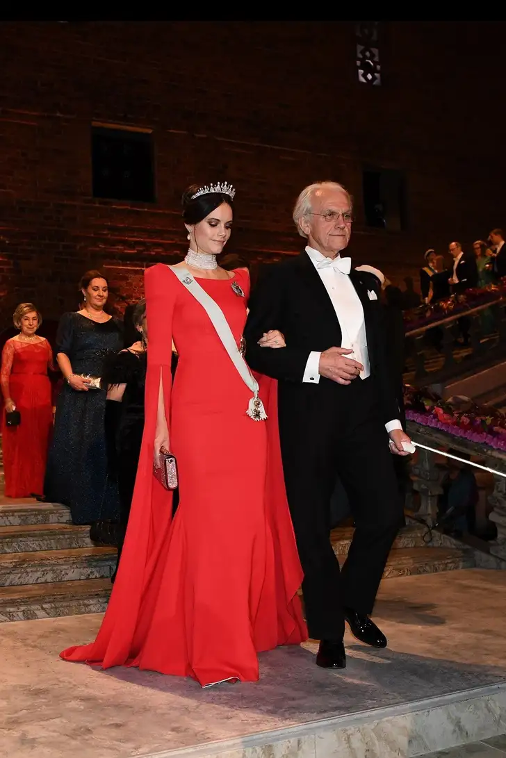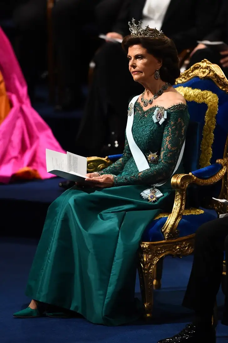 Op het Koninklijke Kapsel rustte de 9-Prong Tiara, een favoriet van Silvia die ze al heel vaak naar de Nobelprijzen heeft gedragen.