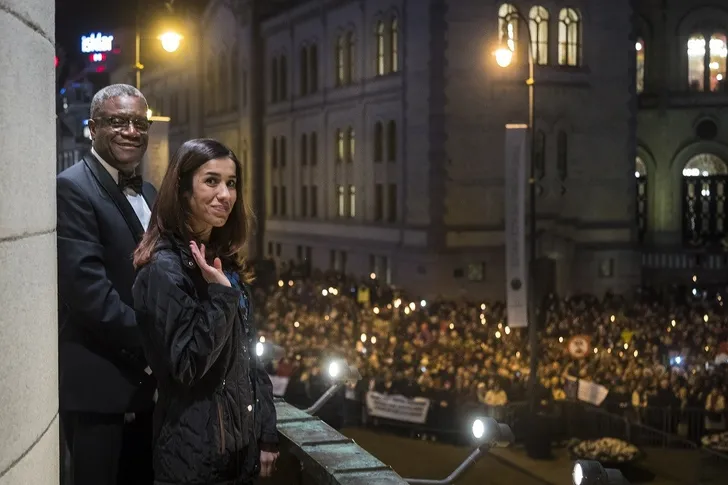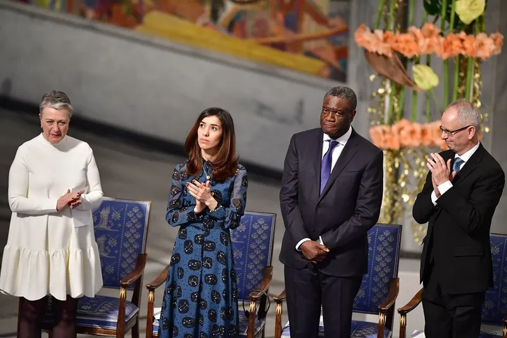 ...de Congolese gynaecoloog Denis Mukwege (2e van rechts) en mensenrechtenactivist Nadia Murad (blauwe jurk).