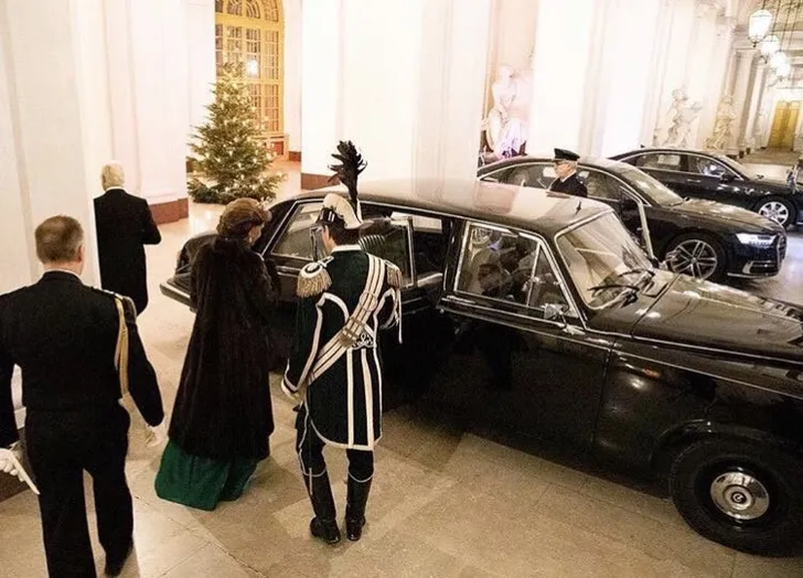 Zo stap je koninklijk in: droog, warm, geen natte voeten, de wagen arriveert in een corridor ín het paleis.