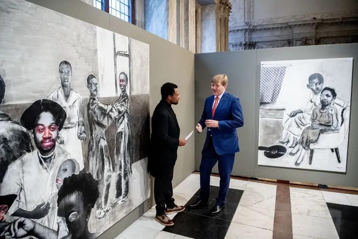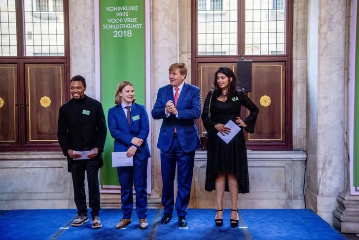 Na deze toch wat taaie start van de dag ging de koning door naar Amsterdam. Daar reikte hij de Koninklijke Prijs voor Vrije Schilderkunst 2018 uit in het Koninklijk Paleis Amsterdam. Hier is hij in gesprek met kunstenaar Neo Matloga.