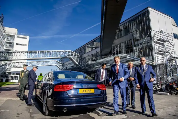 De buitengewoon lange koning heeft een verlengde Audi in verband met de beenruimte. En een chauffeur en altijd een parkeerplek. En beveiliging en mannen in uniformen en pakken als ontvangstcomité. En de onvermijdelijke burgemeester, in dit geval Aboutaleb. Dus moet dit Rotterdam zijn.