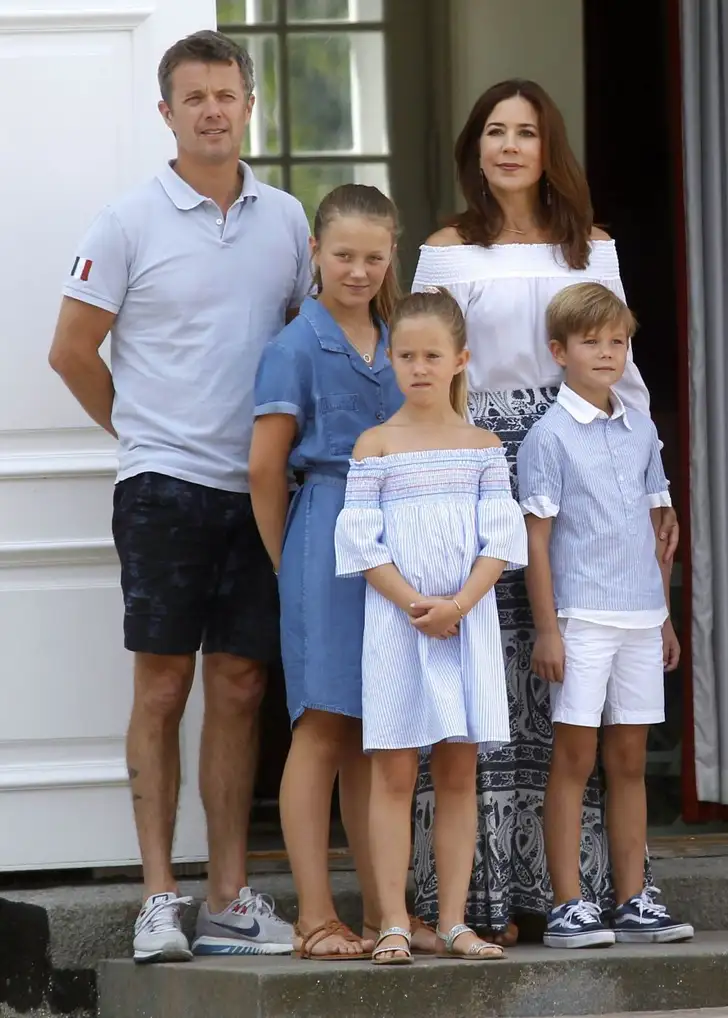 Hoe lief is dit? Kroonprinses Mary en prinses Josephine kozen allebei voor een Bardot-top voor dit zomerse fotomoment.
