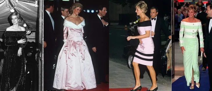 Prinses Diana droeg in 1983 deze avondjapon met een Bardot-hals naar een balletvoorstelling in Australië.