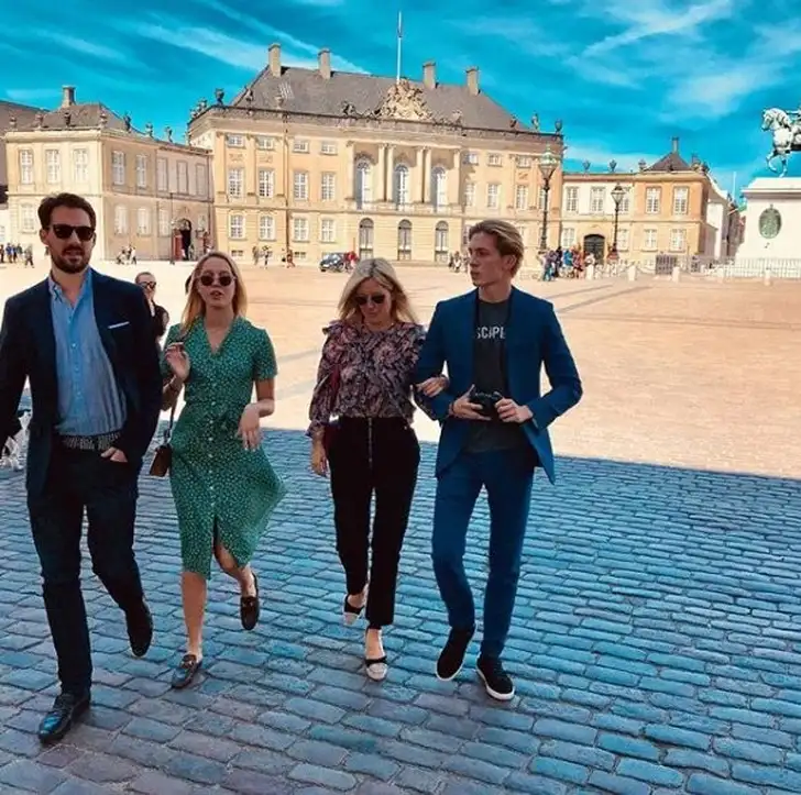 Intussen druppelden in Paleis Amalienborg ook de gasten voor het grote feest dat koningin Margrethe II voor haar zoon geeft binnen. Links prins Constantine Alexios van Griekenland, rechts zijn zus prinses Maria Olympia, respectievelijk een achterneefje en – nicht van Frederik. Beiden moesten duidelijk nog even door de wasstraat voor het label 'white tie' gepast is.