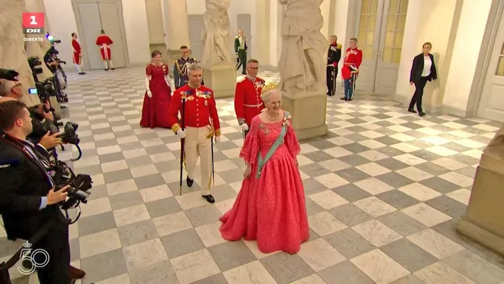 Koningin Margrethe leek een beetje moeilijk te lopen, maar was spectaculair as ever in koraalroze kant met klokmouwen waar haar ordelint lekker bij vloekte. En omdat ze nu eenmaal Margrethe is en gevoel voor glamour heeft, ook haar gouden Naasut Tiara #alseenbaas.