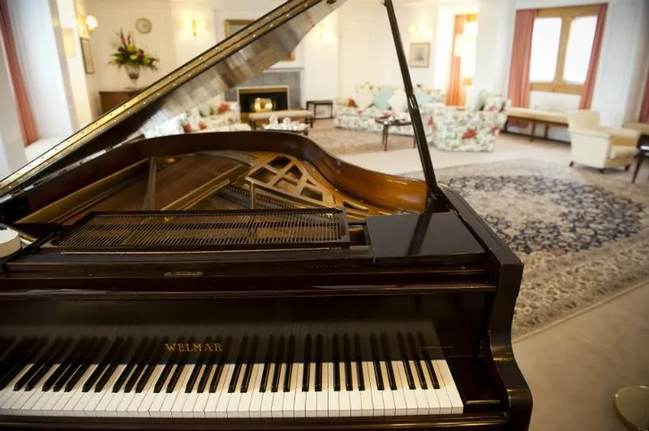 De Welmer Baby Grand Piano staat met zware moeren vastgenageld op de vloer, om te voorkomen dat ie zou gaan schuiven op ruwe zee.