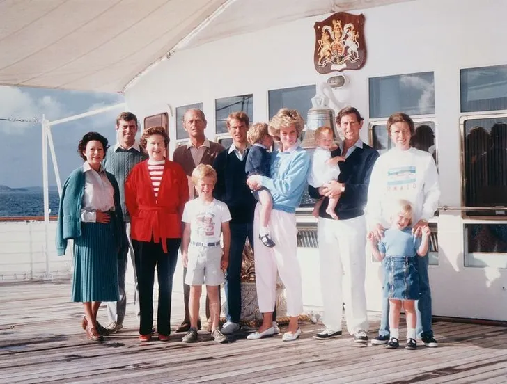 ,,, als in de tijd dat er kleinkinderen over het dek holden. De al wat grotere kinderen zijn Peter en Zara van prinses Anne, prinses Diana heeft prins William op de arm, Charles prins Harry.