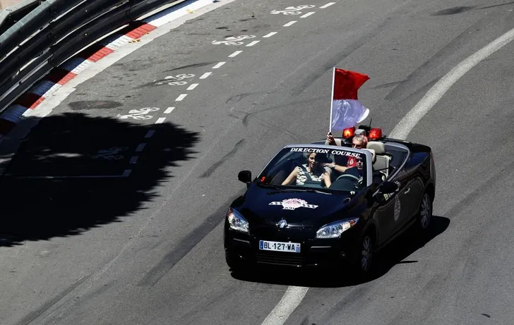 Prins Albert van Monaco heeft een zwak voor alles met een stuur en vier wielen. Hier rijdt hij alvast het parcours van de F1 van Monaco. Prinses Charlene lijkt het niet héél erg opwindend te vinden.
