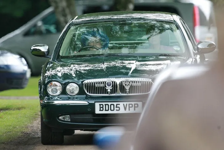 En ja, ze is echt zo klein: Hare Majesteit komt amper boven het stuur van haar Jaguar uit. Die een echte royal Jag is, op de grill zit een ER schildje, afkorting van Elizabeth Regina. Het rechterbordje is hilarisch genoeg van de Engelse versie van de ANWB, alsof er geen beveiliging achter rijdt als de Queen eens panne zou hebben.