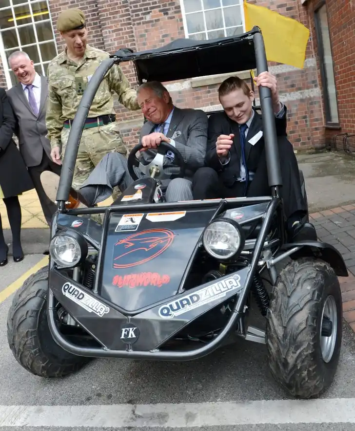 Kroonprins Charles is gehecht aan de luxe dingen des levens, zoals een Jaguar of Rolls met chauffeur. Deze quad was het duidelijk niet helemaal, al bewijst deze foto wel dat hij de keurige lange kniekousen van een echte heer draagt #geenblootbeen.