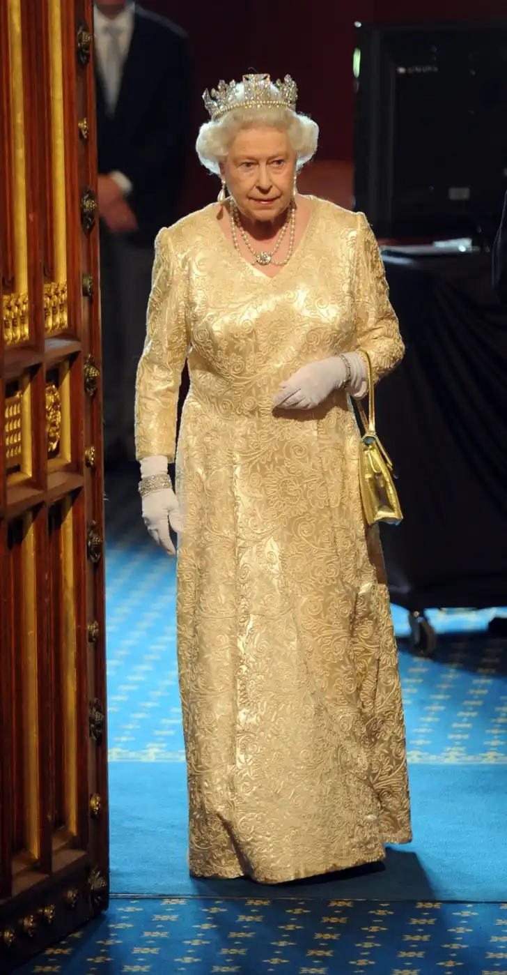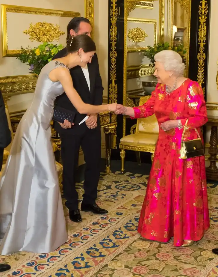 Voor een privédiner met prins Karim Aga Khan IV en zijn familie (dit is prinses Salwa) in Windsor Castle droeg Hare Majesteit een oogverblindende robe in rood, roze en goud, waarbij uiteraard een gouden tasje niet mocht ontbreken.