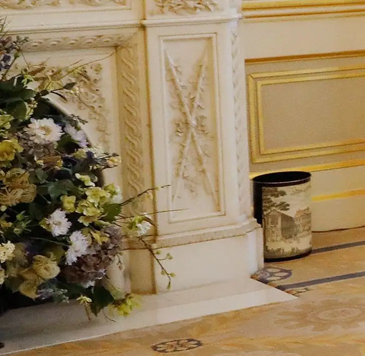 We constateren dat ons favoriete nepbloemstuk nog altijd in de haard staat én dat de koning in deze zaal een buitengewoon adorable prullenbakje heeft staan, dat doet alsof het óók antiek is, net als de rest van het meubilair.