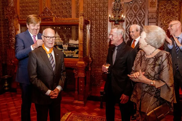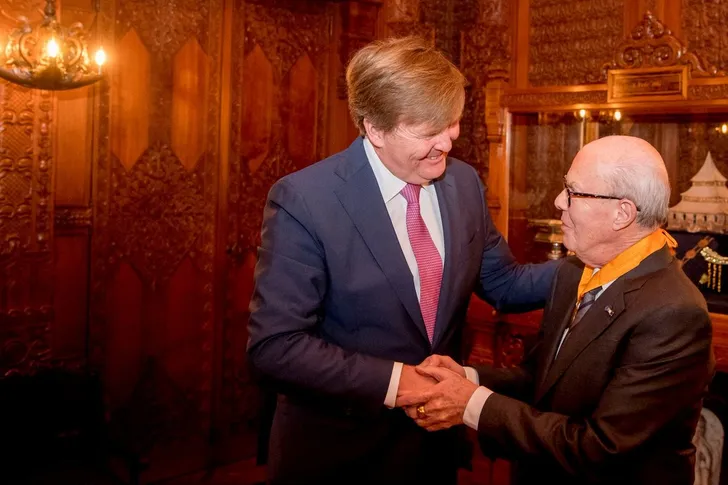 's Middags reikte hij - en het was nog best even frutten met de sluiting - de eremedaille voor Kunst en Wetenschap van de Huisorde van Oranje uit aan choreograaf Hans van Manen. Deze eremedaille wordt toegekend aan personen met uitzonderlijke verdiensten op de terreinen kunst en wetenschap. Prinses Beatrix keek goedkeurend toe. Of riep aanwijzingen, daar willen we vanaf zijn.