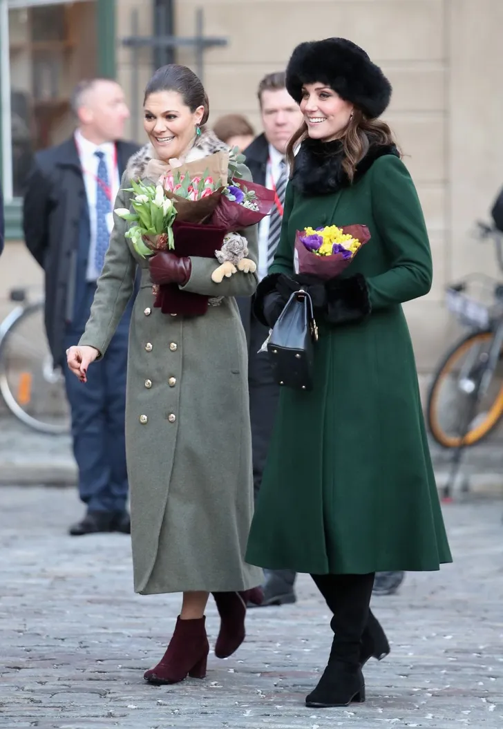 Ook voor het outdoor programma hadden de Koninklijke Hoogheden qua styling leuk rekening gehouden met elkaar. Victoria droeg een Ida Sjöstedt jas met een Marzio tasje, Kate een jas van (onder voorbehoud) Catherine Walker, met col van faux bont met bijpassende manchetten van Troy London UK...