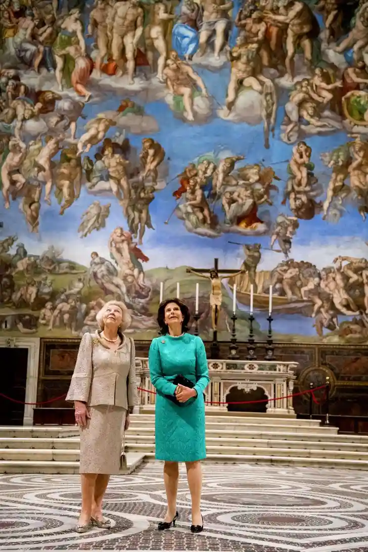 Weer een kunstmomentje: prinses Beatrix en koningin Sylvia van Zweden in de Sixtijnse Kapel tijdens de opening van de tentoonstelling Rembrandt at the Vatican, met Zweeds en Nederlands werk van Rembrandt.