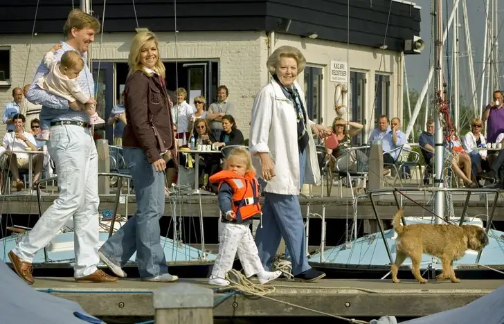 Gezellig een dagje varen: koningin Beatrix ging met Willem-Alexander en Máxima het IJsselmeer op met de Groene Draeck. Haar hond Chip wist zo te zien de weg en oma hield de aanstaande troonopvolgster stevig bij de hand.