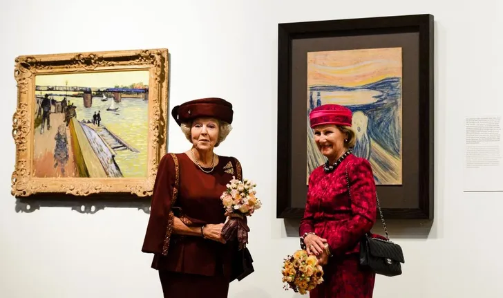 Koninklijke Kunstuitleen: prinses Beatrix en koningin Sonja van Noorwegen tijdens de opening van de tentoonstelling Munch : Van Gogh in het Van Gogh Museum.