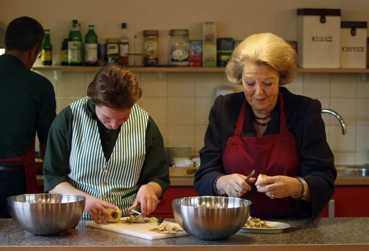 Zo huiselijk zagen we Hare Majesteit maar zelden. Koningin Beatrix bereidde een appeltaart met Frederiek de Sonnaville bewoonster van activiteitencentrum Open erf De Groote Modderkolk in het Gelderse Loenen, #vrijwilligerswerk.