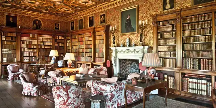 ...waaronder de Rode Bibliotheek met 40.000 boeken), de Chinese slaapkamer en de banketzaal.