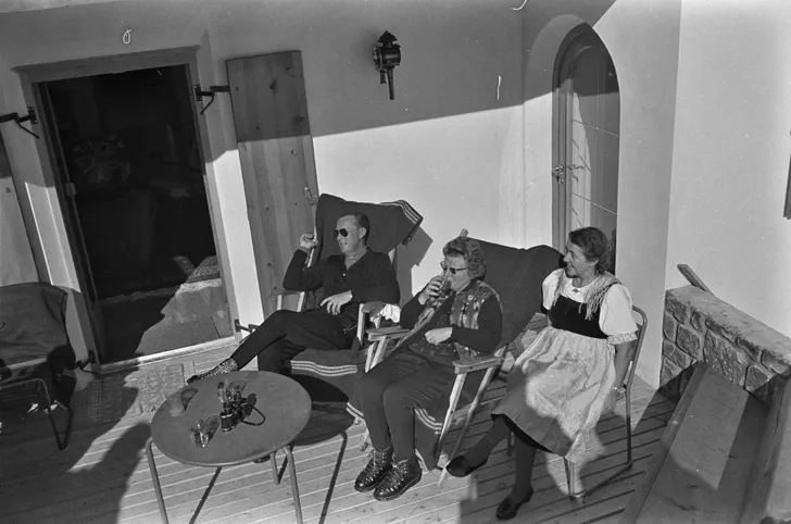 Het is nooit te koud voor een kekke fez, volgens Juliana (rechts), hier in Tirol. Koningin Wilhelmina (links) gelooft het allemaal wel en heeft gewoon alles aangetrokken wat ze bij zich had. De mevrouw in het midden is een hofdame.