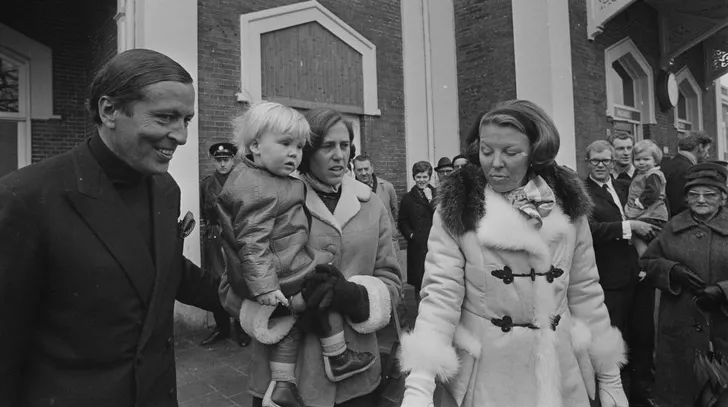 Houtje-touwtje jas, altijd klassiek outdoorsy verantwoord. Willem-Alexander zit hier op de arm van 'zuster Swellengrebel', zijn kindermeisje, personal verpleegkundige en nanny.