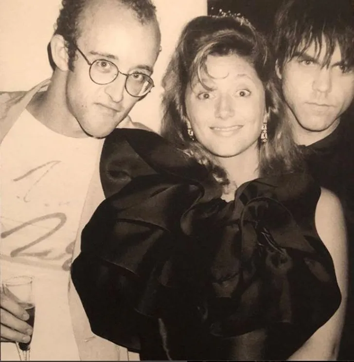 Uit de oude NY doos dook ook dit kiekje op, van Marie-Chantal op haar eindexamendiner, toen ze zo te zien nog een brunette was. Links kunstenaar Keith Haring, rechts ontwerper Steven Sprouse. Beide mannen zijn inmiddels overleden.