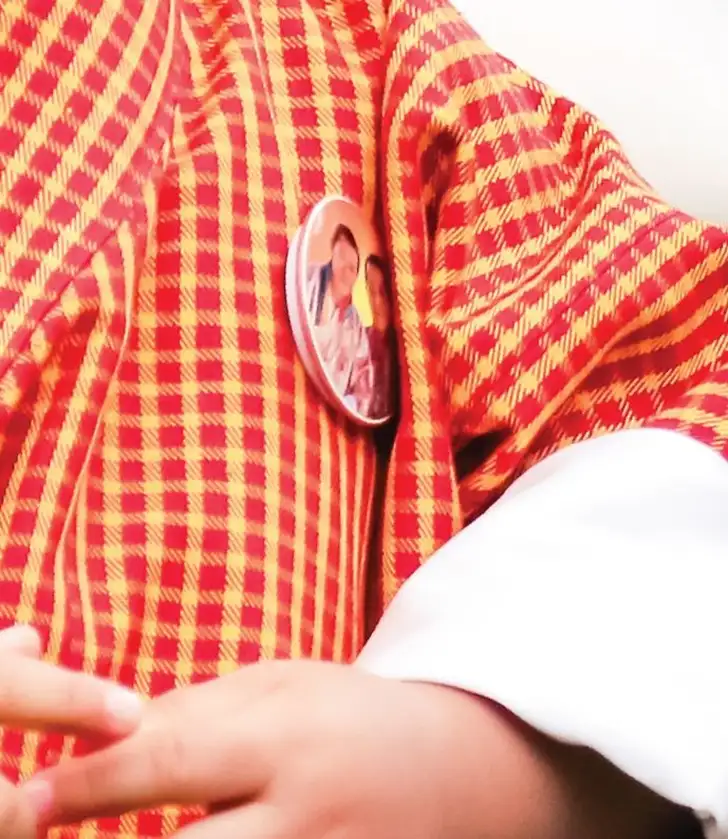 Wij vinden het vooral leuk dat hij zo'n fan van zijn familie is, dat hij een button van zijn vader en zijn opa draagt. De foto komt uit de serie die net na Namgyels geboorte bij Paleis Linkana is geschoten met de koning en zijn vader, de vierde Druk Gyalpo.