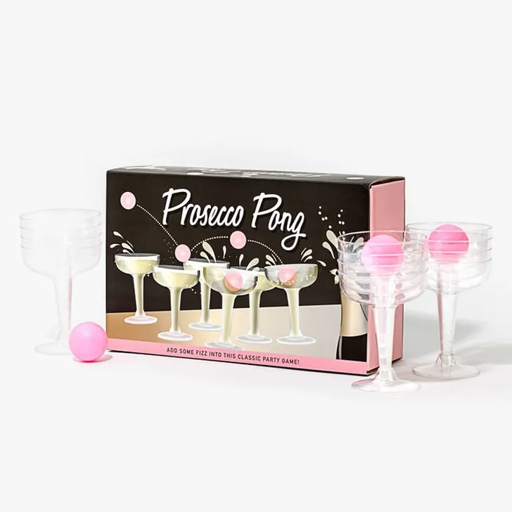 Maar, echte glamourpoezen als we zijn, vullen we die bekers niet met bier maar gewoon lekker met prosecco. Om het spel extra glam te laten zijn kun je hier een speciale prosecco pong set kopen. Je krijgt dan 12 prosecco glazen en 3 roze ping pong ballen.