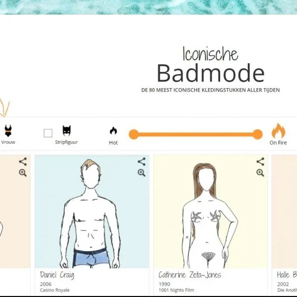 Kun je je nog herinneren wat Halle Barry uit ‘Die Another Day’ en Pamela Anderson uit ‘Baywatch’ droegen? Op deze website kun je filteren naar geslacht en sex appeal, en je kunt kijken of het kledingstuk meer geschikt is om in te zonnebaden of juist om in te zwemmen. Tussen de meest iconische badstukken staan onder andere die van Marilyn Monroe, Elvis Presley en Lady Diana. Meer zien? Check de website van Dreamlines.
