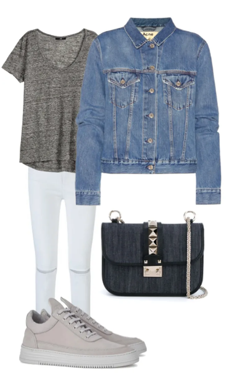 Items in deze outfit: Witte broek - T-shirt - Spijkerjasje - Tas - Schoenen
