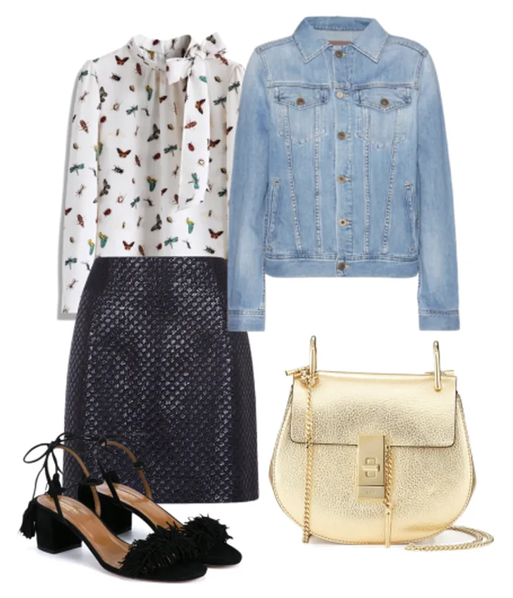 Items in deze outfit: Blouse - Rok - Schoenen - Spijkerjasje - Tas