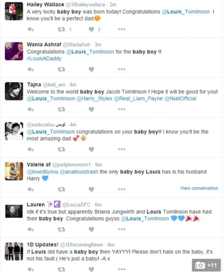 Er gaan geruchten dat One Direction zanger Louis Tomlinson en zijn ex-vriendin Briana Jungwirth een zoontje hebben gekregen samen. Meerdere fans gaan helemaal los op Twitter: