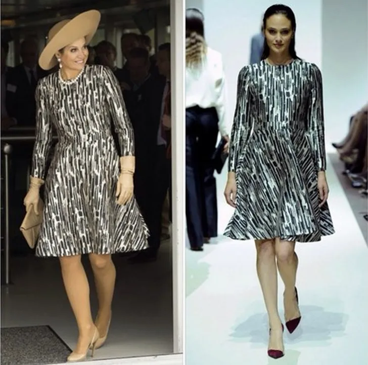 Máxima draagt een jurk van één van haar favoriete ontwerpers, Natan x Edouard Vermeulen (zie hierboven). Daaronder draagt ze nude pumps van L.K. Bennett. Wist je dat je benen door een nude kleur langer lijken? Inslaan dus! Verder draagt Max een clutch, in dezelfde kleur, van dezelfde ontwerper.