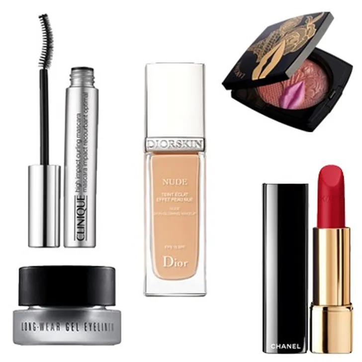 Chanel Rouge Allure Velvet 317 La Précieuse, 32,- | Lancôme Blush Rose Désir, 51,99 | Dior Diorskin Nude Fluid, 47,50 | Clinique High Impact Curling, 21,95 | Bobbi Brown Long Wear Gel, 23,50