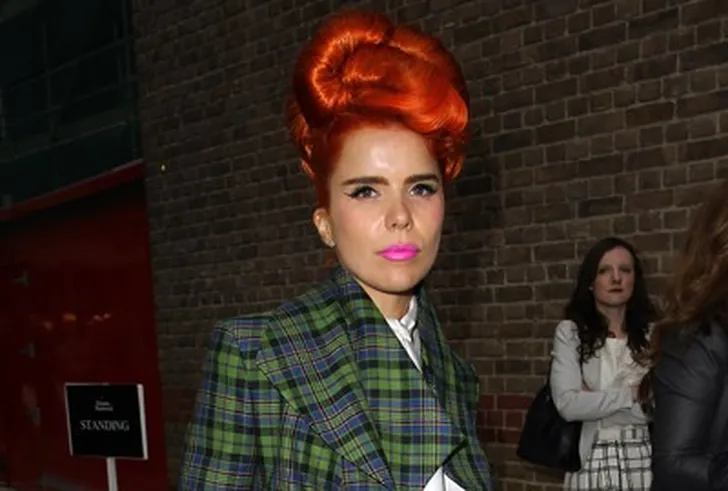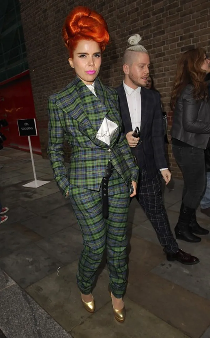 De zangeres hulde zich van top tot teen in een groen met blauw geruit pak. Ze maakte haar look af met glanzende gouden pumps. Haar vurige rood-oranje, opgestoken lokken en fel roze lipstick zijn gewaagd in combinatie met het geruite pak.