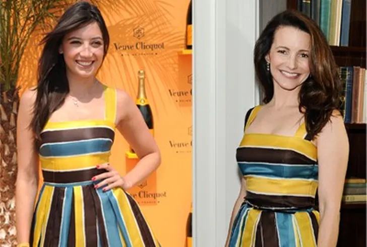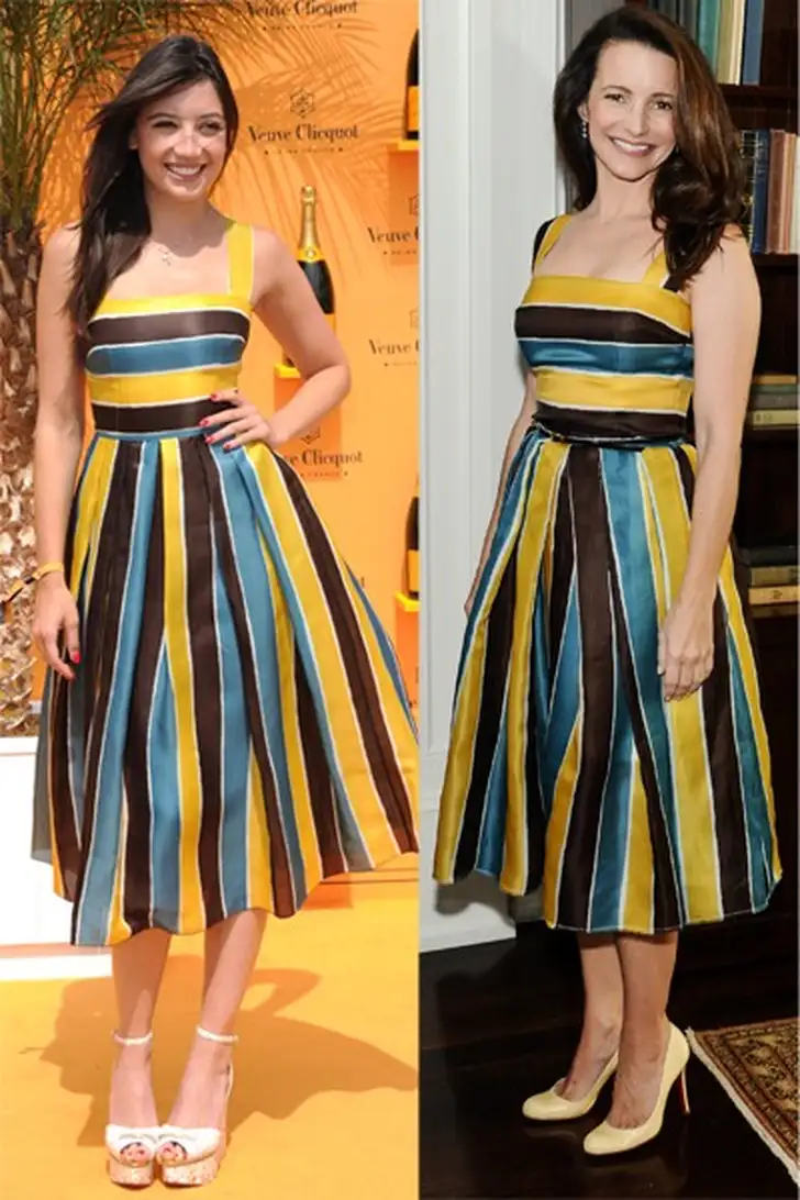 Afgelopen mei droeg Sex and the City veteraan Kristin Davis deze opvallende bruin-geel-blauw gestreepte jurk van Dolce &...