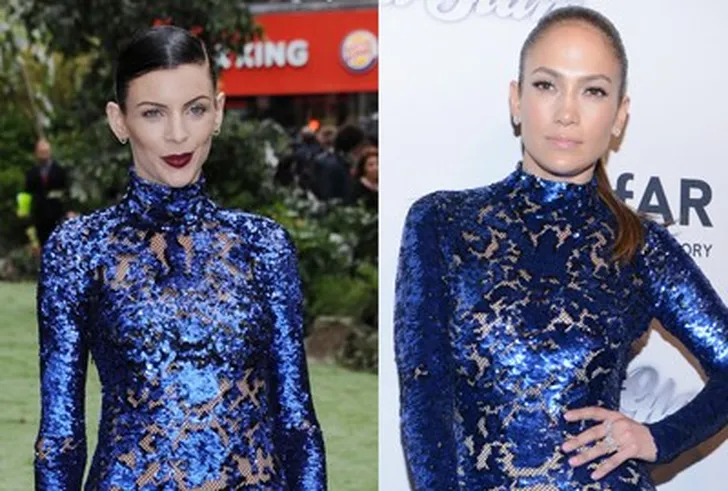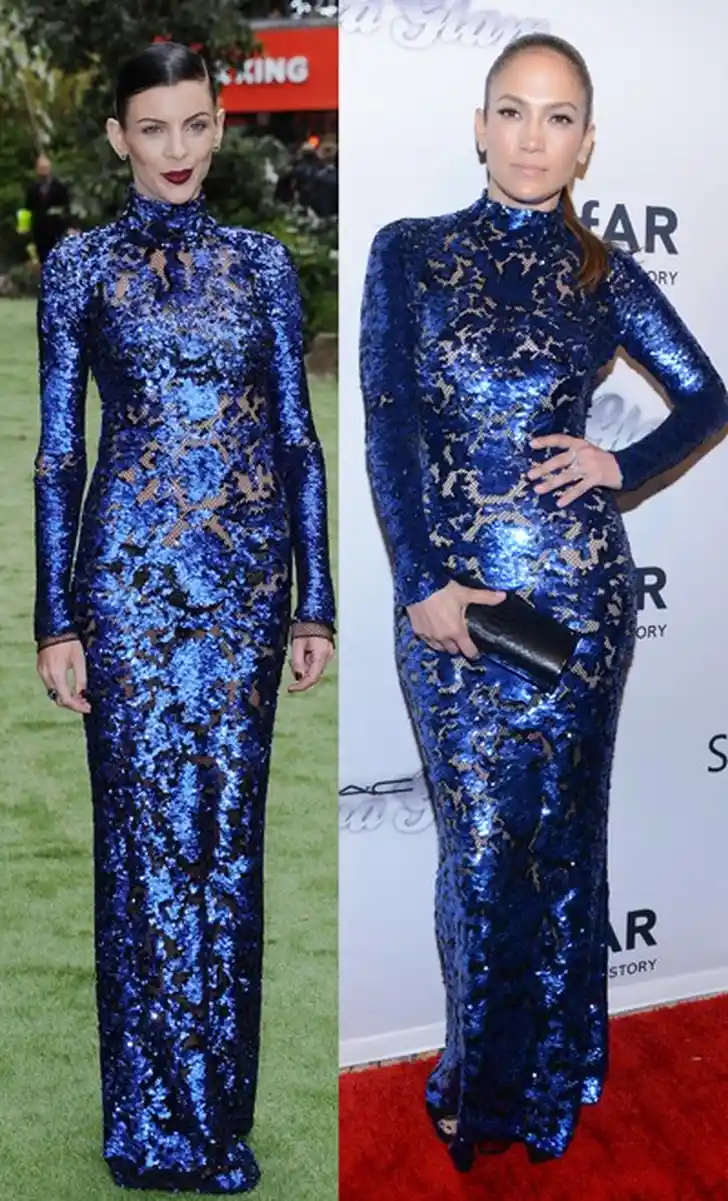Jennifer combineerde het metallic exemplaar met een clutch van Thalé Blanc en juwelen van Harry Winston. Voor een stoer effect zijn haar haren naar achteren gekamt en draagt ze neutrale make-up. Ook Liberty koos voor strak naar achteren gekamt haar, maar knalde met haar make-up en koos voor een felle bordeaux rode lipstick.