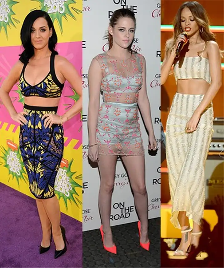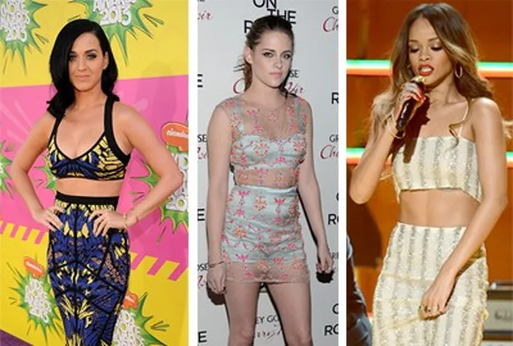 Miss Perry draagt een kleurrijk exemplaar van Hervé Léger, Kristen draagt een Erdem-jurk met neon-accenten en Rihanna een Luciano Soprani-jurk tot aan de enkels. Vorige week liet ook Victoria's Secret Angel Karlie Kloss haar middenrif zien. Bekijk haar look hier.