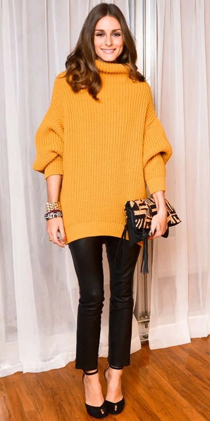 Wat staat Olivia Palermo eigenlijk niet? Tijdens een modepresentatie laat de it girl zien er zelfs in een oversized gebreide trui nog beeldig uit te kunnen zien. Creeer nu de temperatuur daalt eenzelfde look door zo'n trui te combineren met een strak enkelbroekje, hoge hakken en enkele brede armbanden.