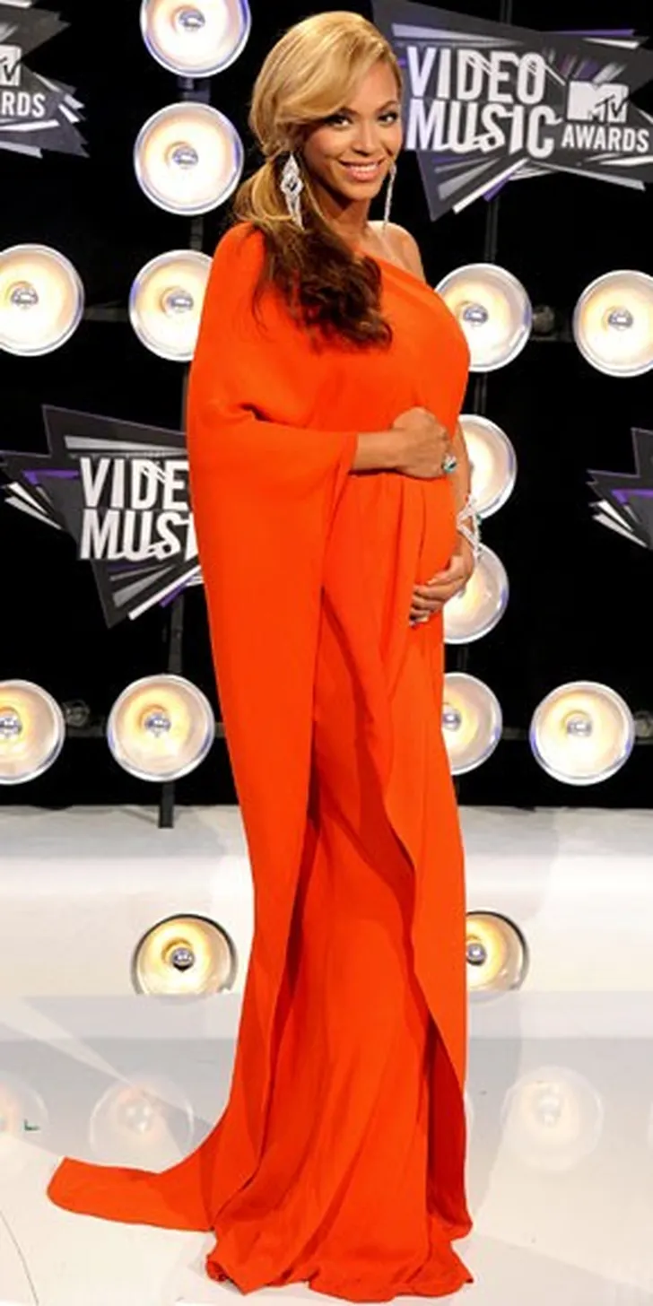 Beyoncé, meestal niet vies van blote benen en decolleté, toont beduidend minder van haarzelf tijdens de Video Music Awards in Los Angeles. Haar asymmetrische Lanvin kaftan is lang en bedekkend, maar verraadt wél de grootste verrassing van de avond: Bee is zwanger van haar echtgenoot Jay-Z. Meer dan enkele Lorraine Schwartz diamanten heeft ze niet nodig om stralend voor de dag te komen.
