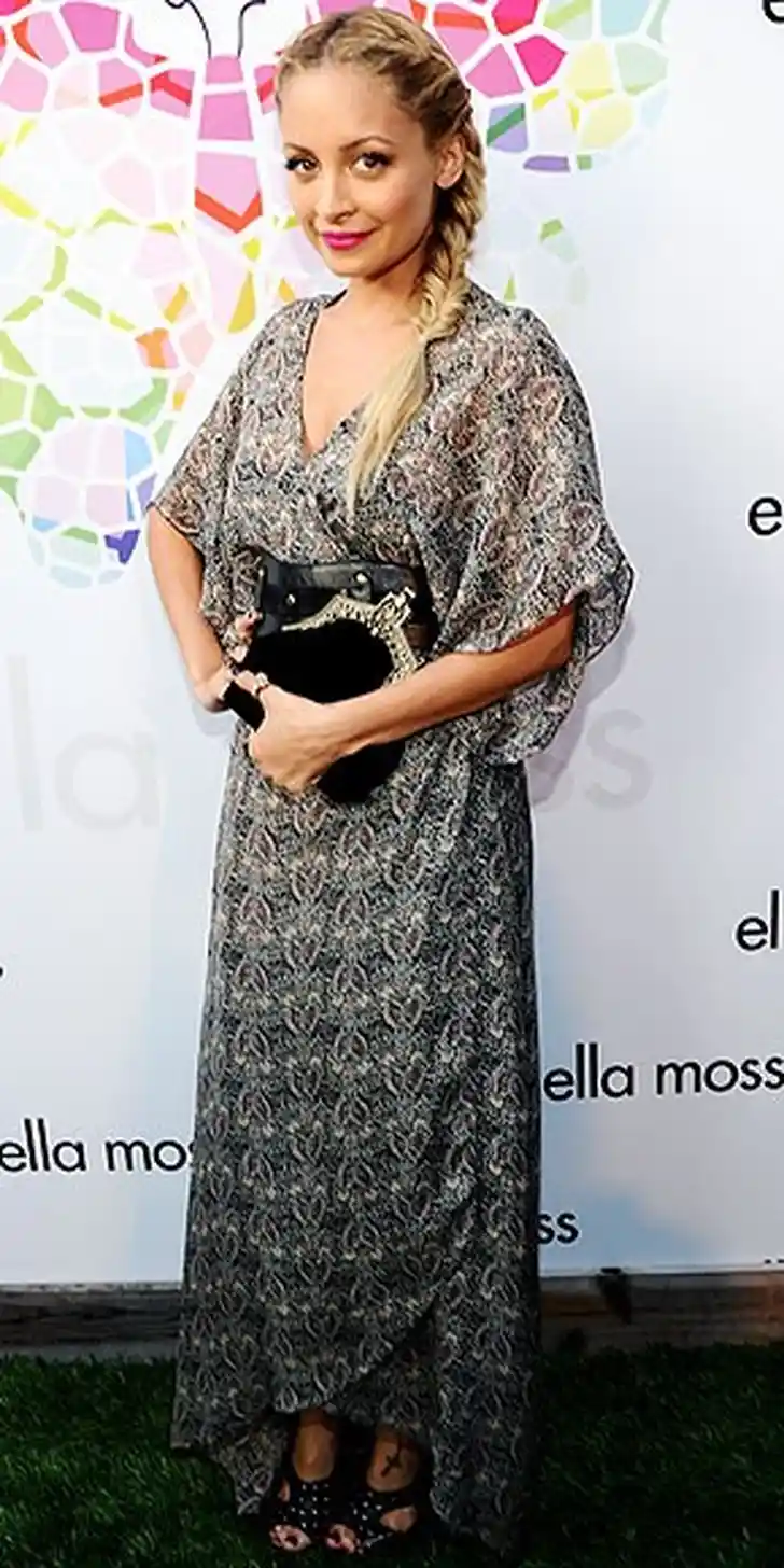 Nicole Richie laat zien dat zelfs met een lengte van 1.55 meter een maxidress goed draagbaar is. De Ella Moss jurk met vlindermouwen wordt in de taille bijeen gehouden door een zwarte riem. De hakken zijn van Givenchy en de clutch is een ontwerp uit haar eigen lijn, House of Harlow 1960. Met de vlecht in het haar blijft Nicole trouw aan haar bohemian chic stijl, de fuchsia lipstick geeft een moderne twist aan haar look.