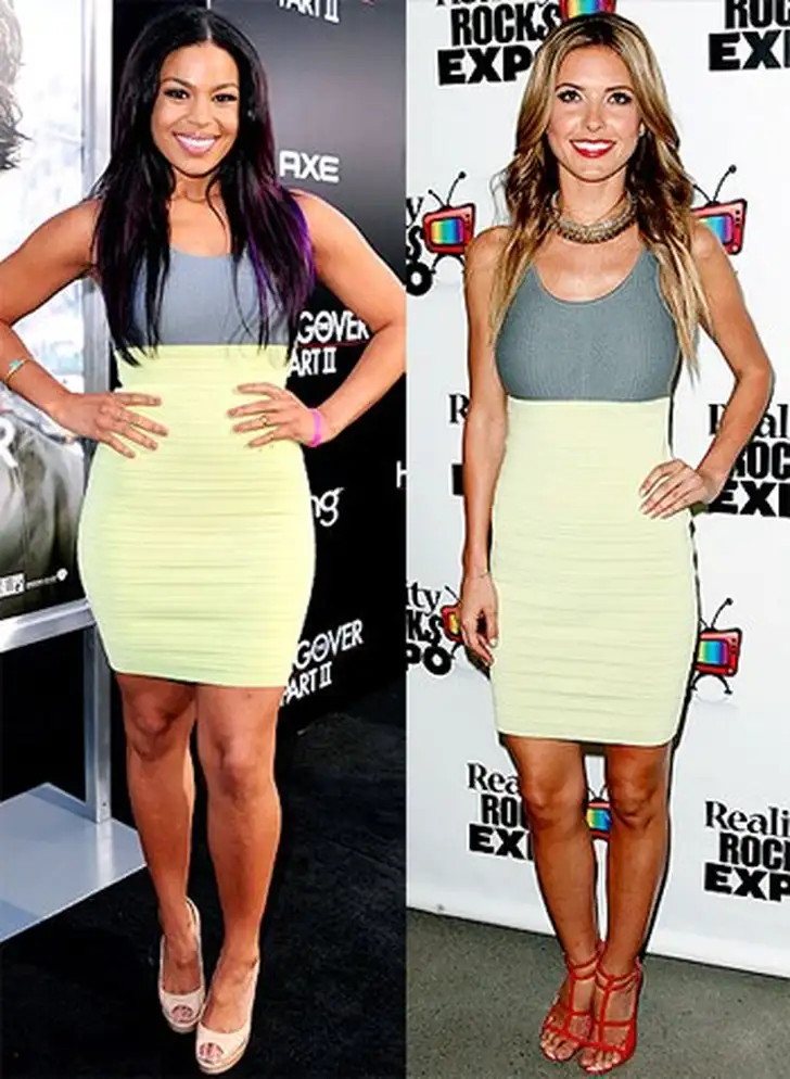 Audrina geeft het Cut 25 by Yigal Azrouël jurkje een spicy touch door de rode sandaaltjes en Jordin gaat voor nude peep toes (en paarse lokken!). Wie staat deze minijurk beter?