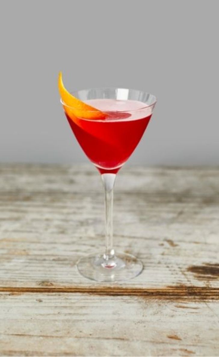 Maak de cocktail af met een sinaasappelschil.
