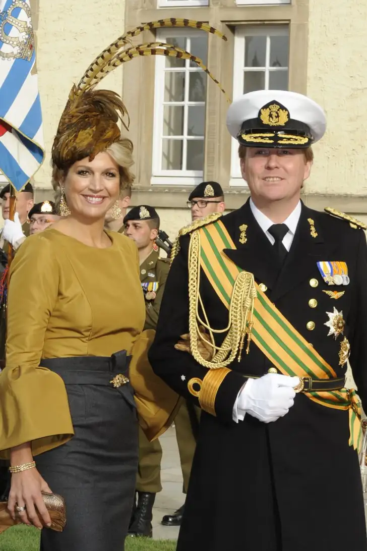 Het topstuk uit Máxima's collectie verenhoeden blijft toch de volledige fazant die ze op haar hoofd zette bij het huwelijk van de Luxemburgse erfgroothertog Guillaume en prinses Stéphanie. Makkelijk om elkaar terug te vinden in het feestgedruis, toch?