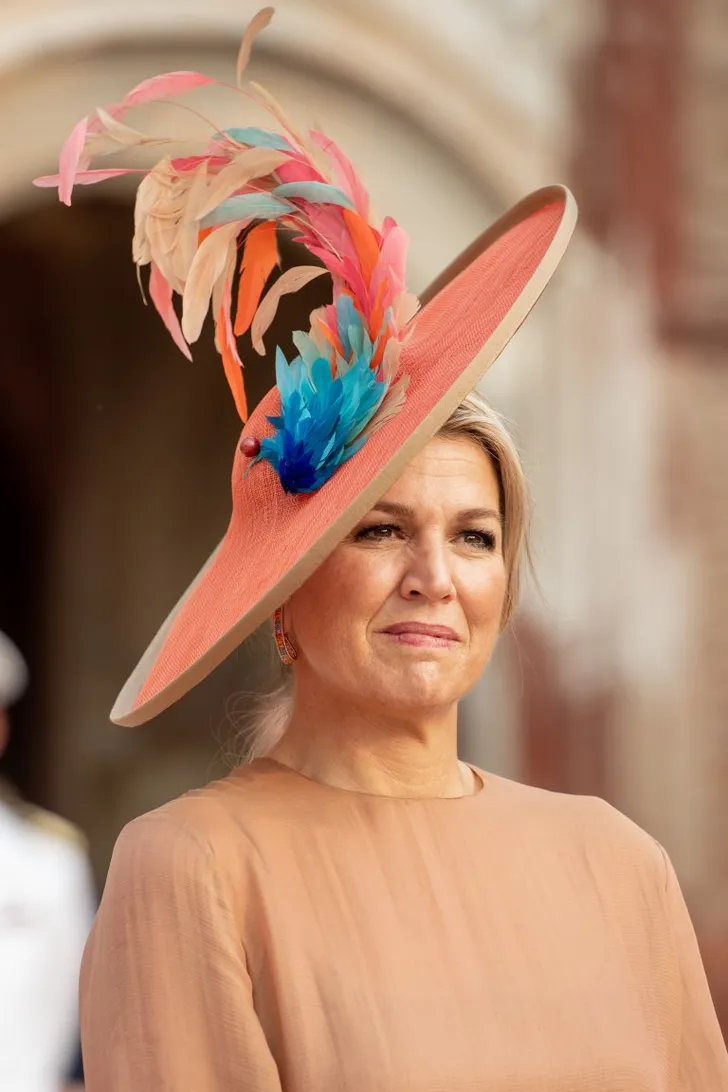Ergens is een verenhoed als een tiara: enig om te zien, maar eigenlijk kom je er alleen als royal mee weg. Koningin Máxima maakt gisteren goed gebruik van dat gegeven met een nieuw exemplaar. Deze was best bescheiden, afgaande op Máxima's vroegere verenpracht...