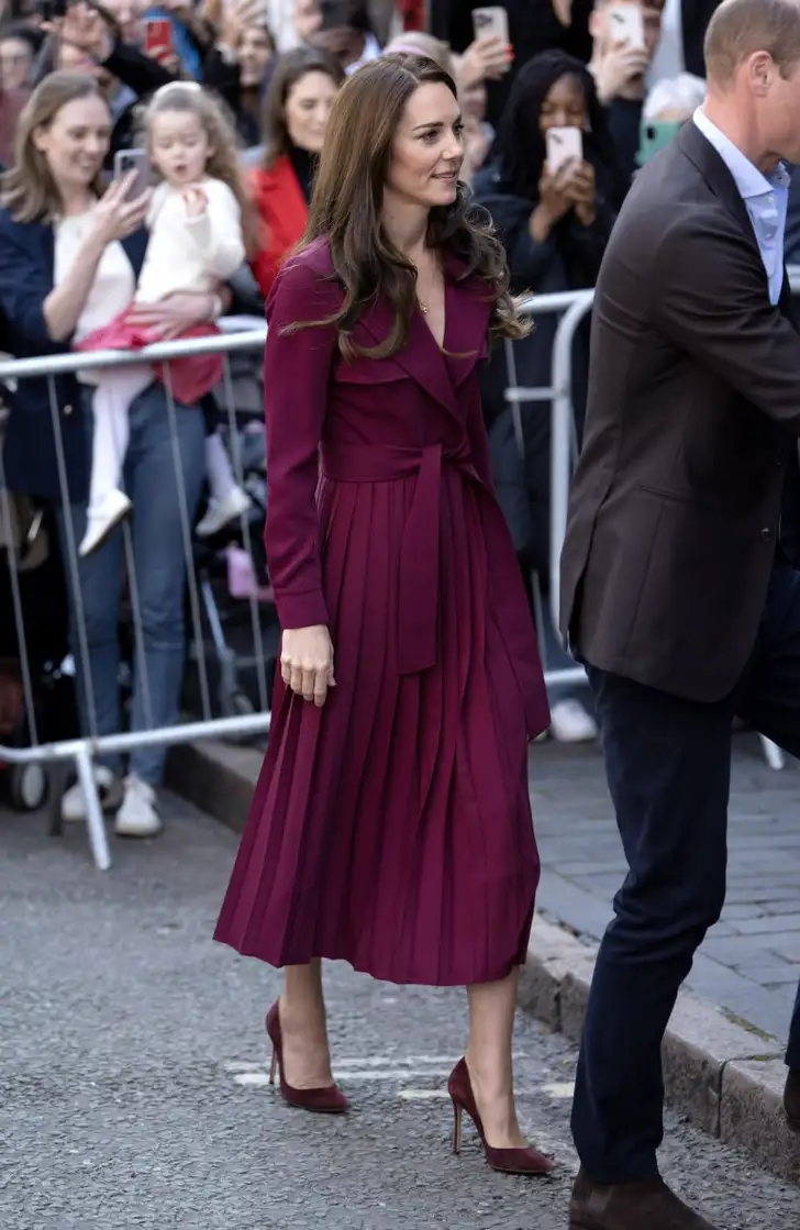 Voor hun eerste royal duty in ongeveer een maand droeg William een lichtblauwe blouse met een donkere blazer, en straalde Kate in een wijnrode jurk van luxemerk Karen Millen, weet Hello! Magazine te melden. Zoet detail is de kleine matchende pochet in wijnrood op Williams blazer – maar dat is niet wat royal fans het meest opviel aan de outfits van het paar. Zo stelt Hello! dat de kleuren die Wills en Kate droegen voor hun uitje heel toevallig ook de clubkleuren zijn van de voetbalclub Aston Villa, waar Wills groot fan van is.
