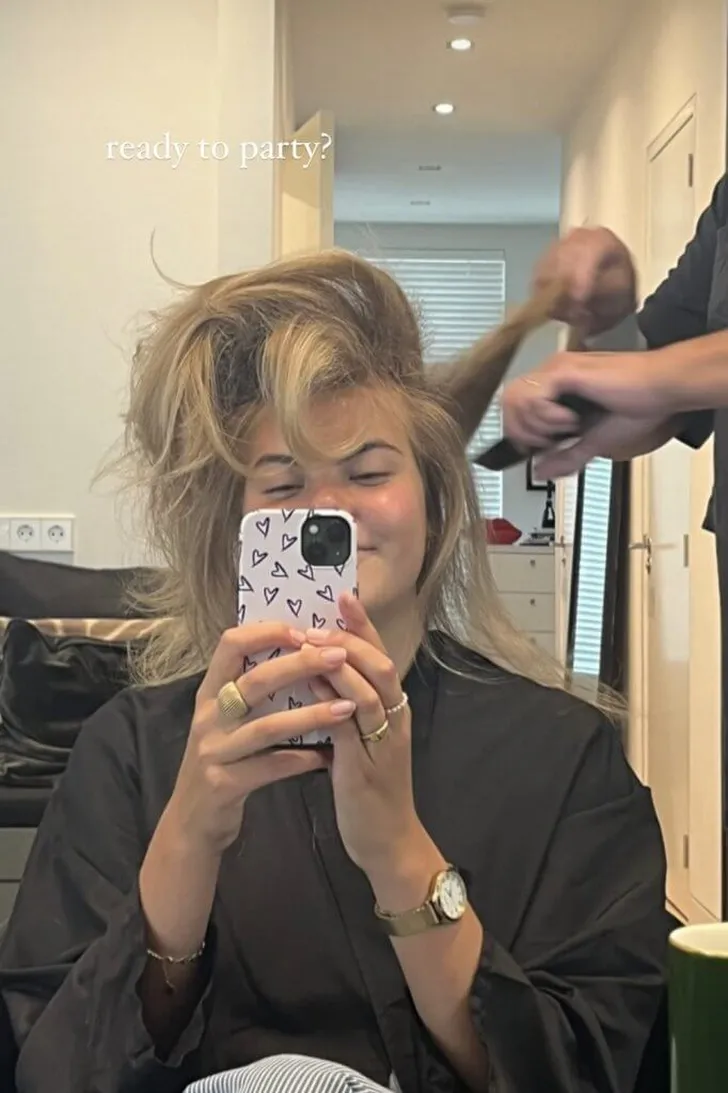 Maar: schijn bedriegt, want op de volgende foto zien we de gravin gewoon plaatsnemen in de kappersstoel van Leco van Zadelhoff – die inmiddels duidelijk aan het touperen is geslagen. "Ready to party?", schrijft ze bij het kiekje.