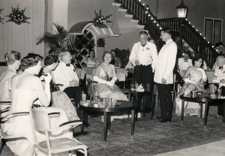 Maar ook het eiland Curaçao is meerdere malen bezocht door de prinses. Hier zien we de - destijds nog - kroonprinses als stralend middelpunt van het gezelschap, tijdens haar bezoek aan Curaçao in februari 1958.