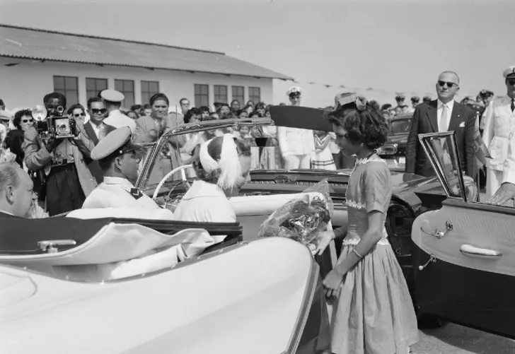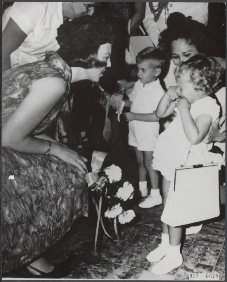 Op onderstaande foto is prinses Beatrix nog maar 20 jaar oud en brengt ze eveneens een bezoek aan Aruba. Ze wordt warm ontvangen in Santa Cruz door een arsenaal aan mensen en krijgt bloemen aangeboden door een Arubaans meisje.